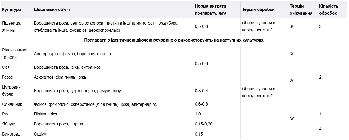 Захищає від хвороб: Борошниста роса, Септоріоз, Плямистість, Іржа, Фузаріоз, Церкоспорельоз, Альтернаріоз, Фомоз, Антракноз, Гниль, Церкоспороз, Пірікуляріоз, Парша, Оїдіум