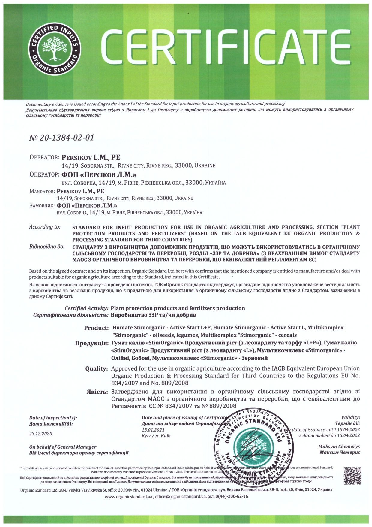 С радостью хотим Вам сообщить, что компания "СтимОрганик" получила подтверждение, по Сертификации вспомогательных веществ для использования в органическом производстве по системе "Органик Стандарт", а также о том, что ряд продуктов компании являются пригодными для использования в органическом сельском хозяйстве по Стандартом аккредитованных органов Сертификации по органическому производству и переработки, эквивалентный регламентам Европейского Союза № 834/2007 и 889/2008, а именно: