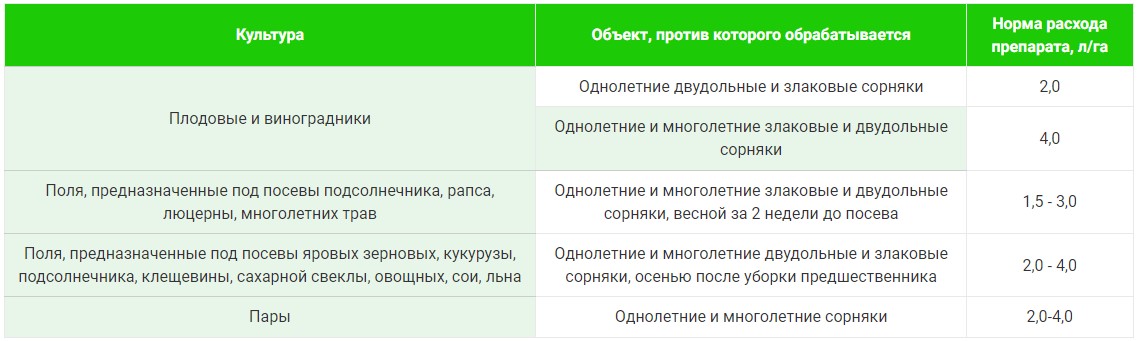 В предпосевной период препарат вносят опрыскиванием сорняков, которые проросли и активно вегетируют. Внесение проводят за 2 недели до посева культуры. В период после уборки предшественника препарат вносят после массового появления сорняков. В обоих случаях для эффективного уничтожения многолетних сорняков исключают механические обработки почвы в течение 2 - 2,5 недель до и после внесения препарата.