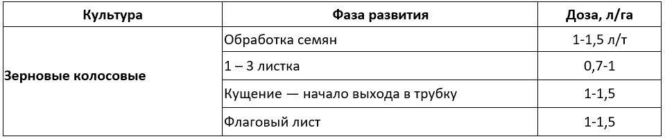 Препаратом обрабатываются семена непосредственно перед посадкой и подпитываются внекорневым методом (в фазе кущения и в фазе флажкового листа) зерновые культуры (озимой и яровой пшеницы, ячменя, овса, ржи).